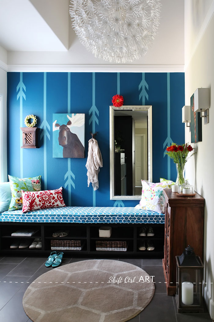 Umm, yep….I’m a little foyer-fixated this year. And this is another choice that’s sneakily a way to get in a whole room full of great projects by featuring one of said projects. Kelly and her husband turned a headboard into that bench there and made it look like it was always a bench. And also she bought that amazing rug AND made a table for the other side of the foyer that you can’t even see in this picture. So much fabulous in one little space!